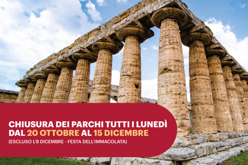 Si informano i gentili visitatori che i Parchi archeologici di Paestum e Velia sono chiusi al pubblico tutti i lunedì dal 20 ottobre al 15 dicembre 2025, escluso lunedì 8 dicembre in occasione della festività dell'Immacolata Concezione, per attività di formazione obbligatoria del personale interno. Ci scusiamo per il disagio.