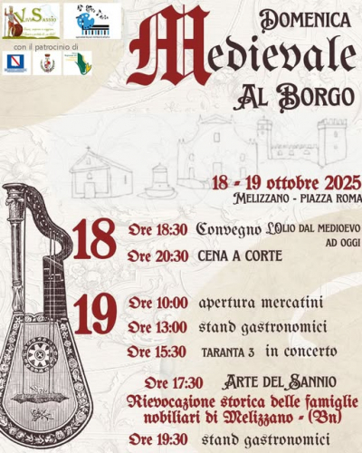 Il 18 e 19 ottobre 2025, Melizzano si prepara ad accogliere la quinta edizione di “Domenica Medievale al Borgo”, un viaggio indietro nel tempo tra atmosfere d’altri tempi, tradizioni popolari e sapori autentici. Il borgo si trasformerà per due giorni in un villaggio medievale animato da figuranti in costume, mercatini artigianali, musica, spettacoli e rievocazioni storiche.