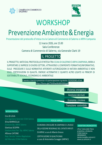 La Camera di Commercio di Salerno, nell'ambito del progetto "Sostenibilità e Transizione Ecologica", annuncia un importante appuntamento dedicato al supporto tecnico e normativo per le imprese del territorio. Il 12 marzo 2026, alle ore 15.00, presso la Sala Conferenze della sede in via Generale Clark 19, si terrà il workshop "Prevenzione Ambiente & Energia".